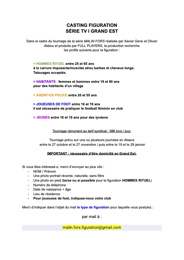 Tournage rémunéré au tarif syndical : 98€ brut / jour. Tournage prévu sur une ou plusieurs journées en Alsace entre le 27 octobre et le 27 novembre / puis entre le 19 et le 29 janvier