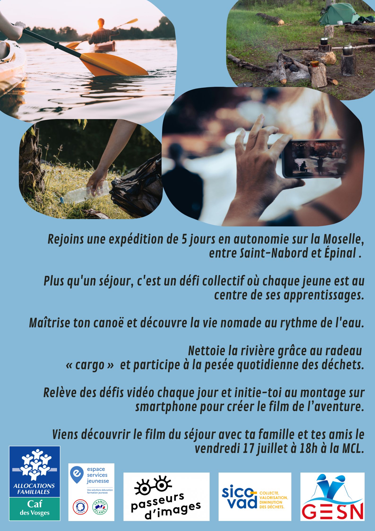 Tu as entre 10 et 14 ans? Tu as soif d’aventure, de grand air et de défis? La MCL lance son expédition pour l’été : 5 jours en itinérance totale sur l’eau, entre Saint-Nabord et Épinal.