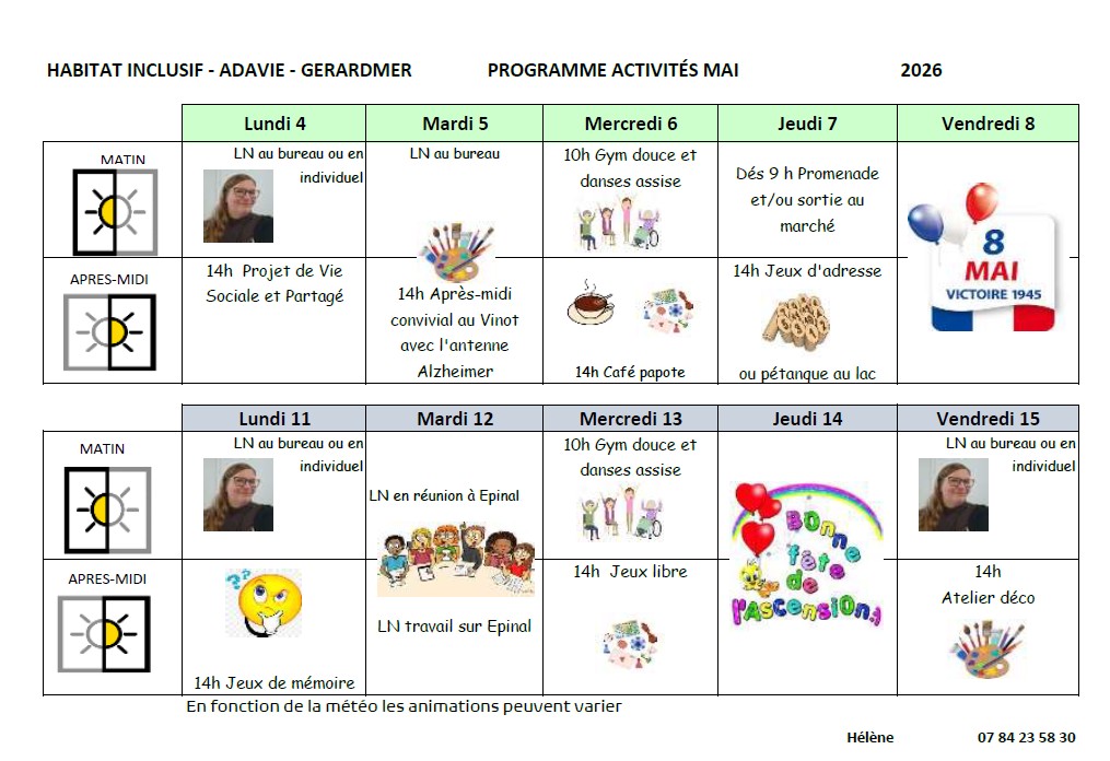 Planning des animations à l'habitat inclusif 2 rue Lucienne.