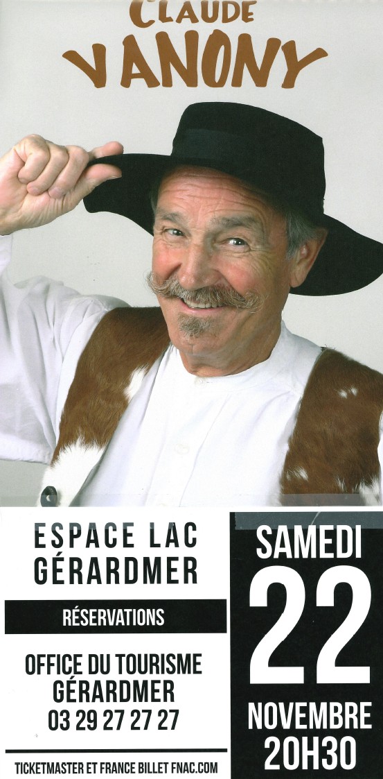 Claude Vanony de retour sur les planches, en pleine forme pour son 90ème anniversaire et accompagné de Dominique Walter. Plus qu'un spectacle d'humour, c'est une bouffée d'air frais qui sent bon le terroir vosgien. Billetterie en ligne et à l'office de tourisme.