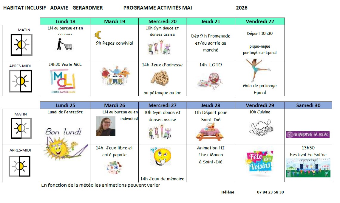 Planning des animations à l'habitat inclusif 2 rue Lucienne.