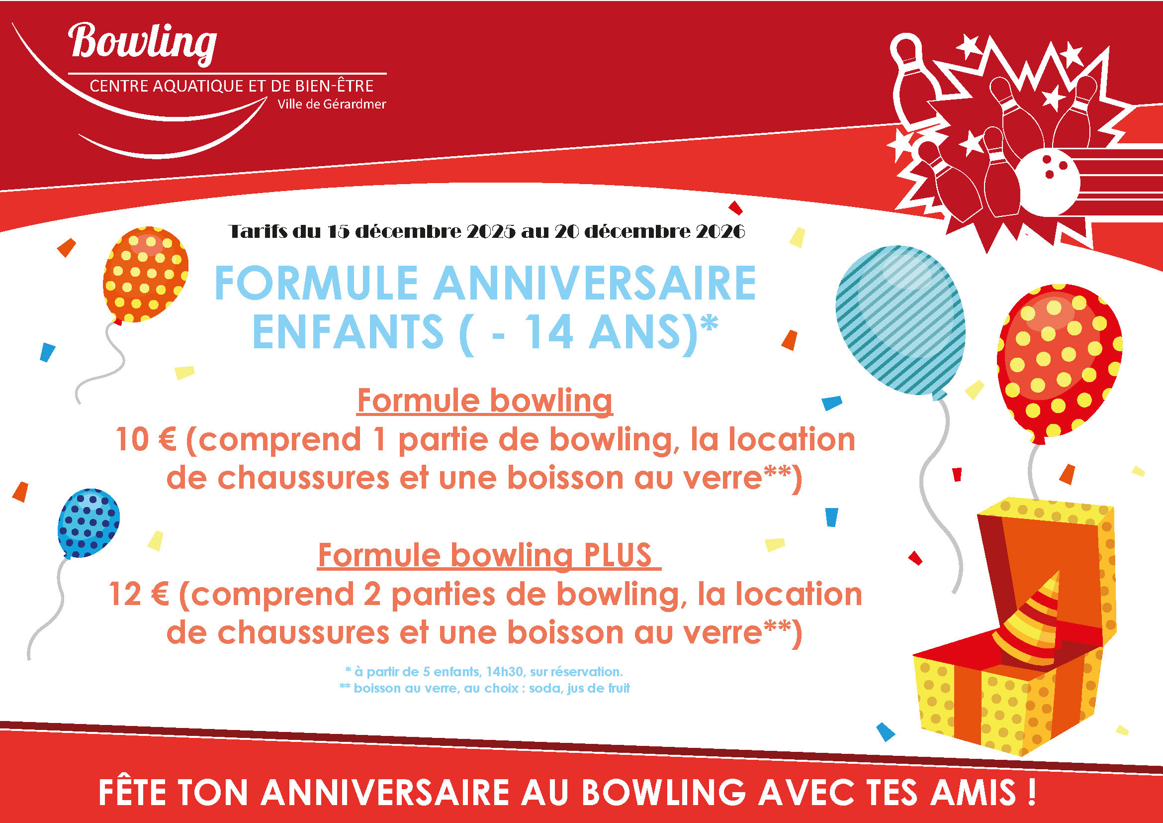 2 parties + location de chaussures + boisson* 12€ |